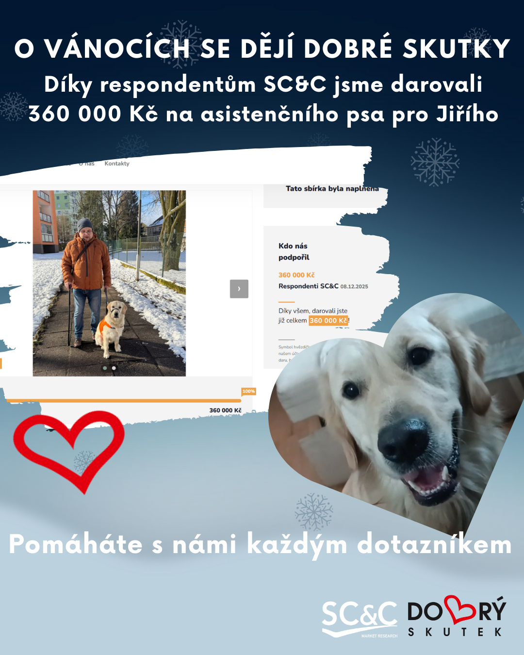 Stejně jako v předchozích letech měli respondenti SC&C možnost vzdát se své odměny za vyplněné dotazníky ve prospěch dobročinných účelů. Díky jejich dobré vůli jsme tak mohli i letos přispět na asistenčního psa, prostřednictvím organizace Dobrý skutek. Tentokrát naši respondenti pomohli panu Jiřímu Starenkovi částkou 360.000 Kč. Jiří se tak může těšit na asistenčního psa Jacka. Ještě jednou děkujeme. Veselé Vánoce!